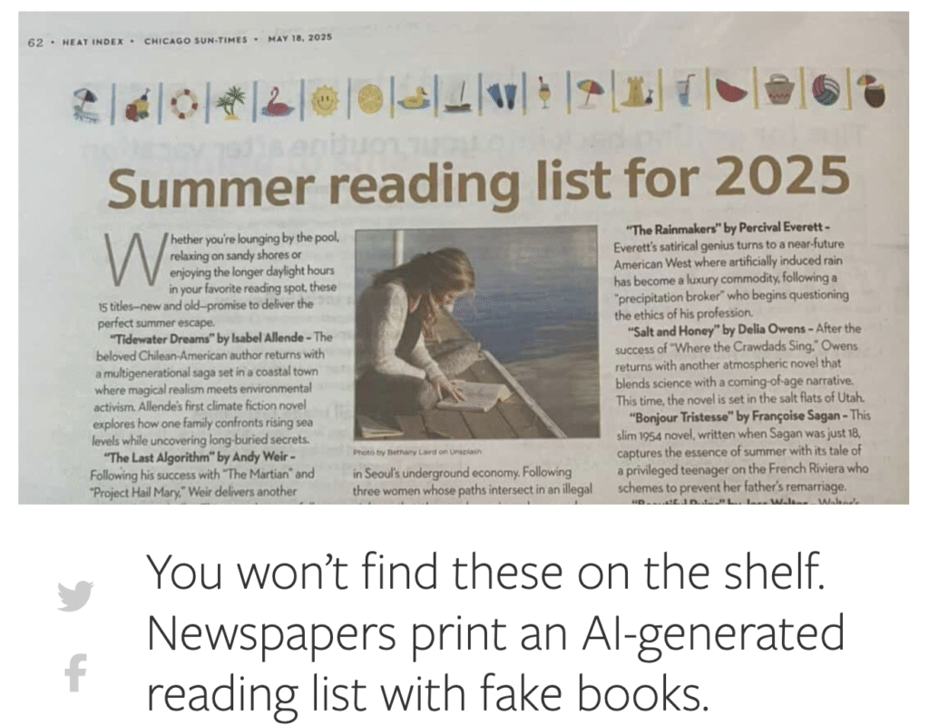 הסיבה לכך די צפויה: מי שהכין את הרשימה, העיתונאי מרקו בוסקליה, השתמש ב-AI והעביר אותה לחברת סינדיקציה, שבתורה סיפקה את התוכן למוסף המיוחד של שיקגו סאן-טיימס (בהמשך התברר שגם פילדלפיה אינקוויירר הדפיס את הרשימה). ומתברר שאף אחד בשרשרת הזו לא טרח לבדוק את התוכן.