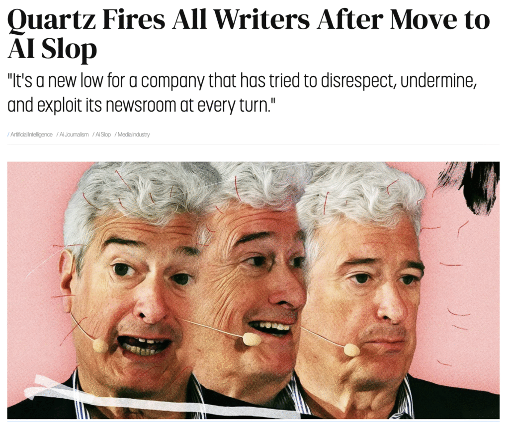 זאק סוורד, שהיום מוביל את תחום ה-AI במערכת ה״ניו יורק טיימס״ ובעברו היה חבר בצוות המייסדים של Quartz (ובשלב מסוים אפילו אחד מהבעלים), פרסם בשבוע שעבר הספד עגום למקום שהיה הבית שלו במשך יותר מעשור: ״לעיתים קרובות נדמה שתעשיית התקשורת היא קרב בין אידיאליסטים לציניקנים. רוב הסטארט-אפים האהובים עליי בתחום המדיה בעידן הנוכחי בחרו במסלול של פעילות ללא מטרות רווח – מסלול שמביא איתו אתגרים משמעותיים משלו, אבל לפחות ציניות אינה אחד מהם. Quartz הוא עכשיו ׳מותג זומבי׳, וזה המהלך הכי ציני שיש בתעשייה הזו״.