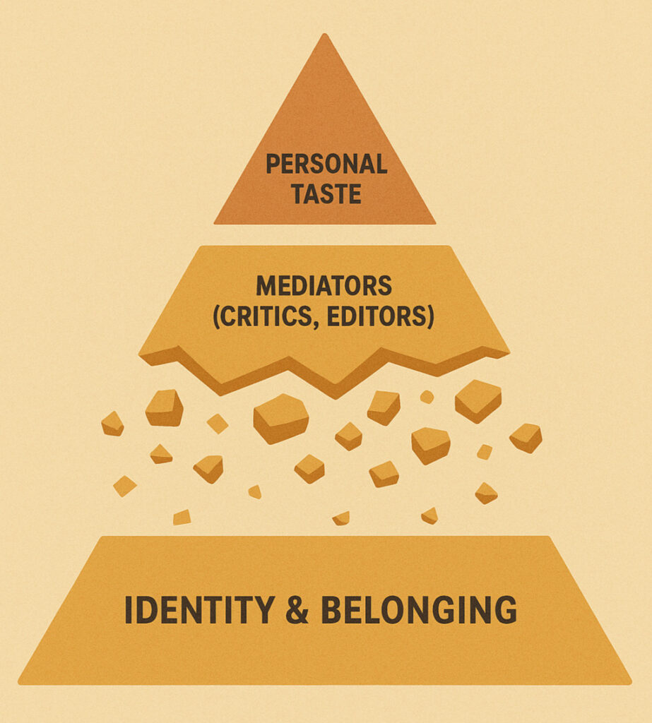 כל זה מחזיר אותנו לנקודה שממנה התחלנו את הסדרה הנוכחית – העלות האפסית של יצירת תוכן. יש לכך משמעות נוספת, שלא נגעתי בה עד עכשיו: היצע אינסופי של תוכן הופך את צריכת התוכן למאתגרת הרבה יותר. אלגוריתמים אמנם יידעו לשדך לי תוכן שיעניין אותי, אבל בתהליך האופטימיזציה שלהם אין כמעט אף פעם אלמנט של איכות. ובתרבות יש גם אלמנט קהילתי, או אלמנט ״מייצר זהות״ – אני רוצה לחוות משהו שגם אנשים אחרים חווים, והשותפות הזו מייצרת חיבור בינינו.